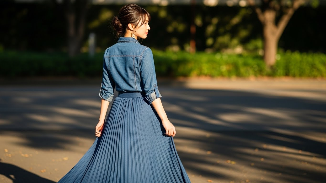 プリーツスカート×デニムシャツ(女性らしさを引き立てる)