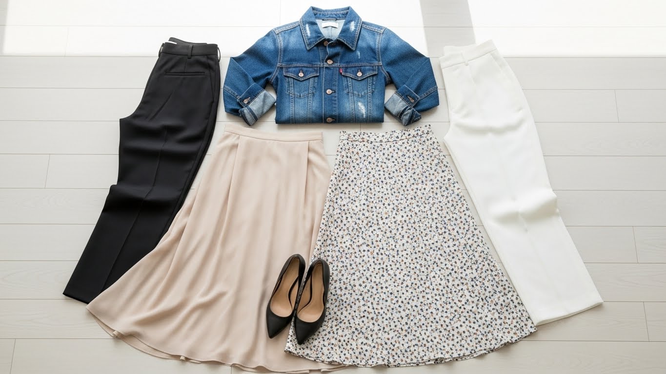 インナーとボトムスの組み合わせを工夫するだけで、印象は大きく変わります。