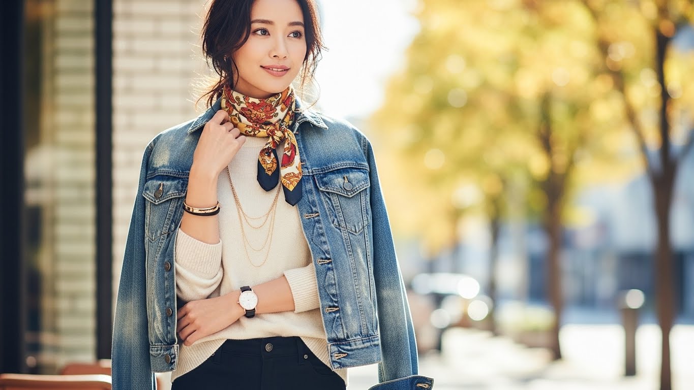 デニムジャケットの下に薄手のニットやカーディガンを重ねると、奥行きのあるコーディネートに。