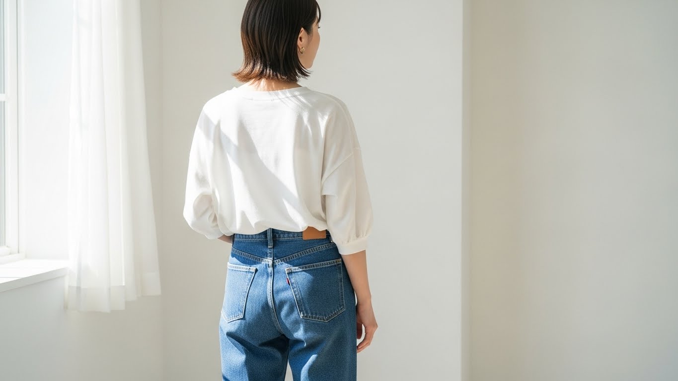 白シャツとデニムの組み合わせは定番ですが、着方次第で印象が変わります。