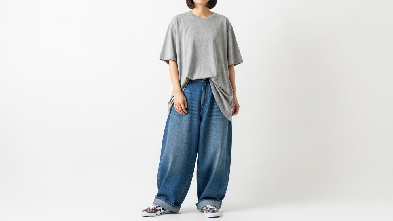 ゆったりデニムに大きめトップスを合わせると、確かに体型はカバーできます。