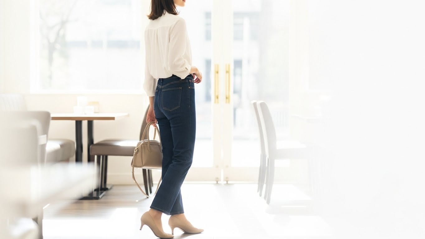 ブラウスにデニム、パンプスを合わせると上品になります。