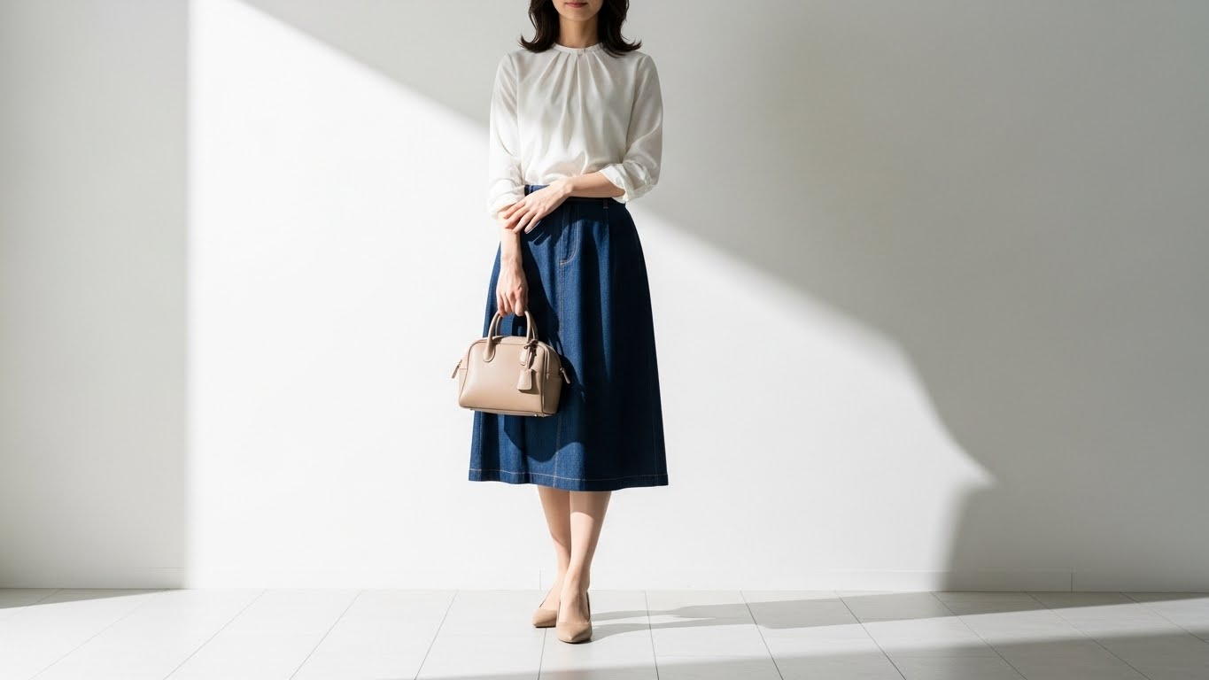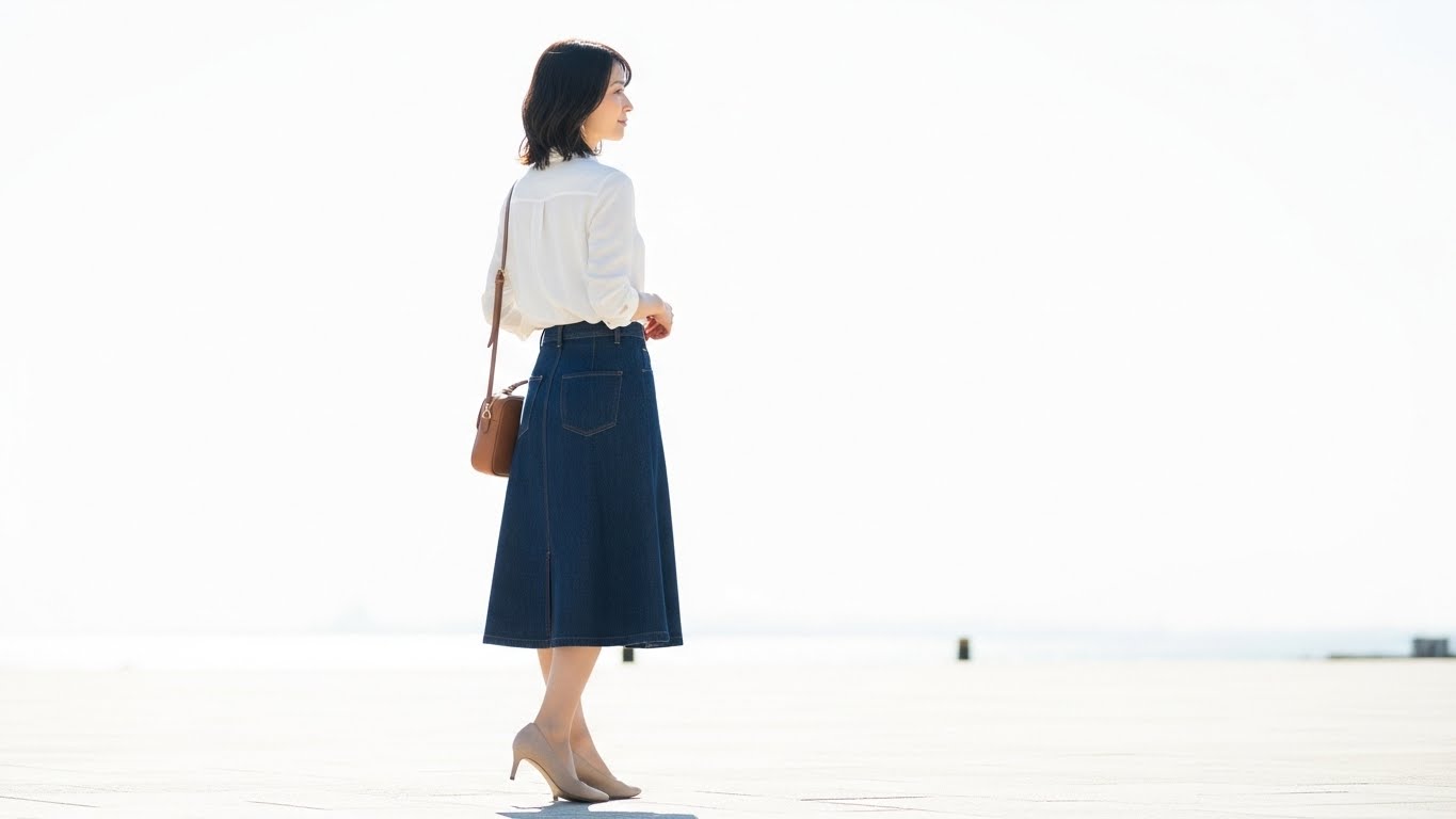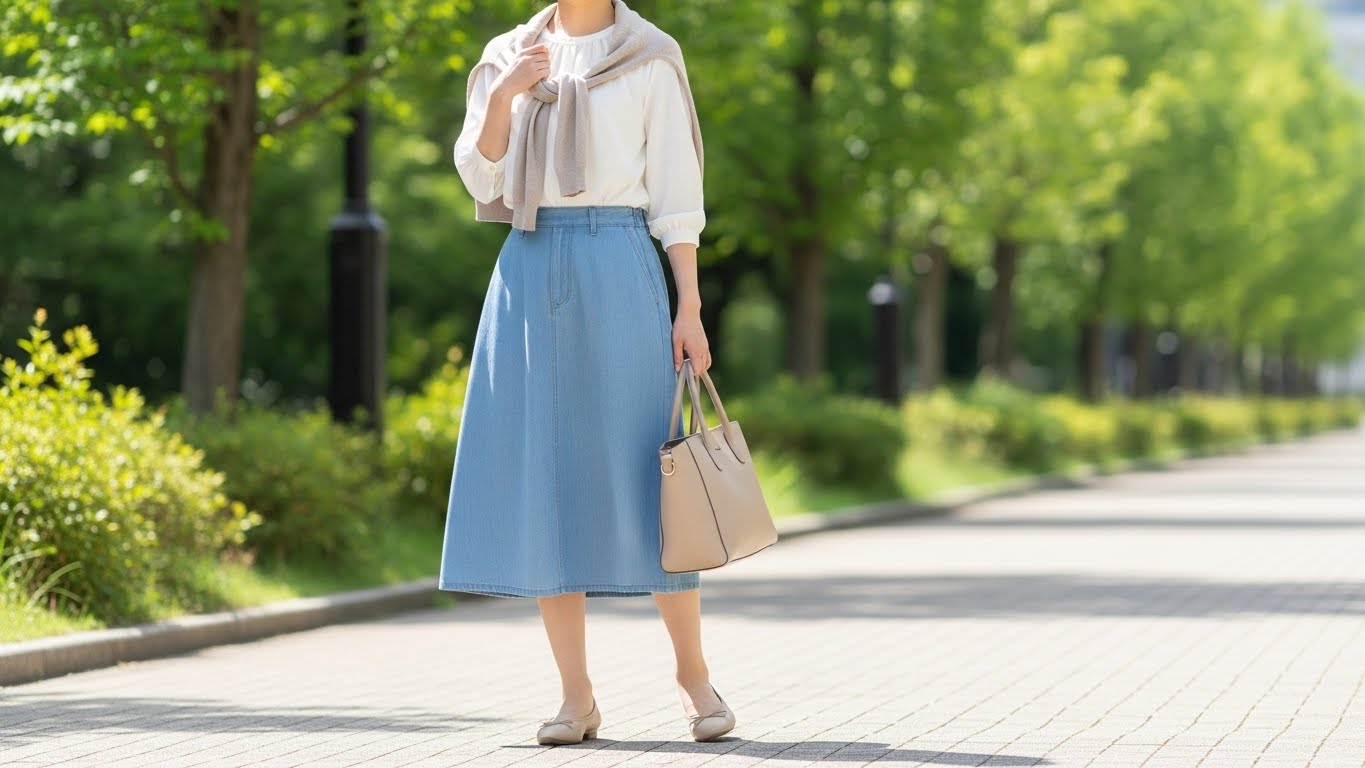 膝丈デニムスカートに白シャツを合わせた定番スタイルは、職場でも浮きません。