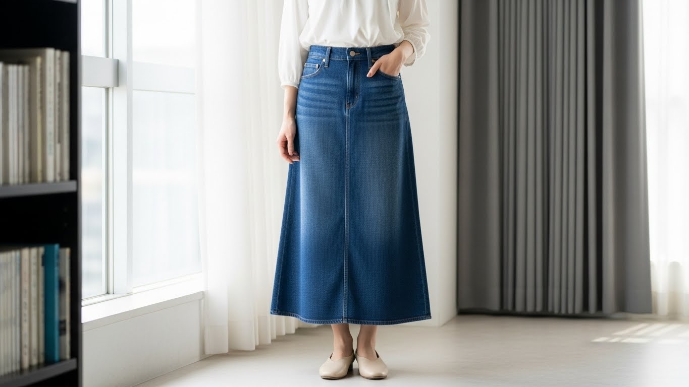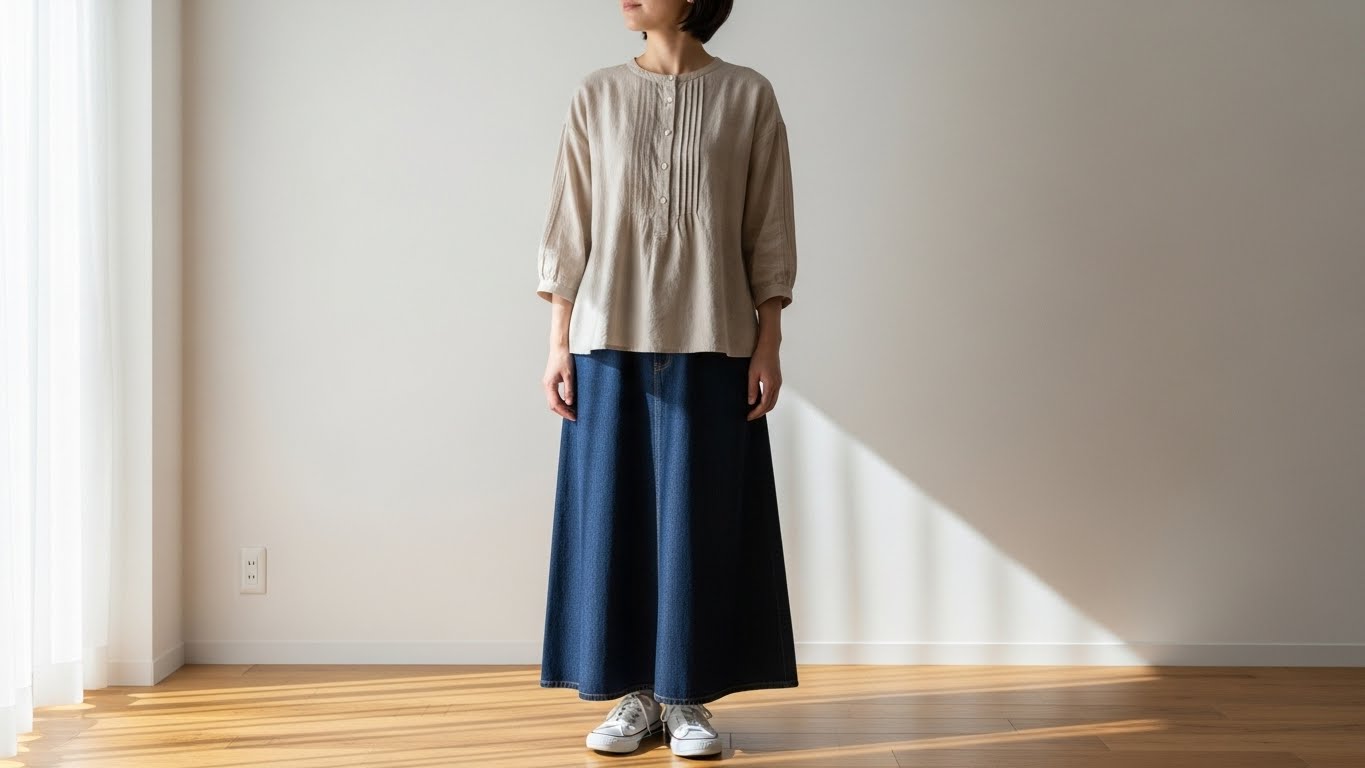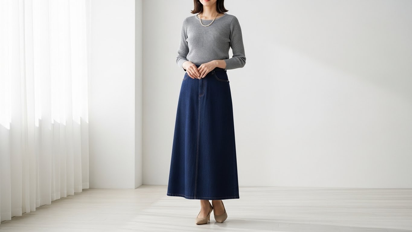 デニムスカート ロング 大人 コーデで悩んでいる30〜40代女性向けに、体型カバーしながらおしゃれに見える着こなし術をお伝えします。