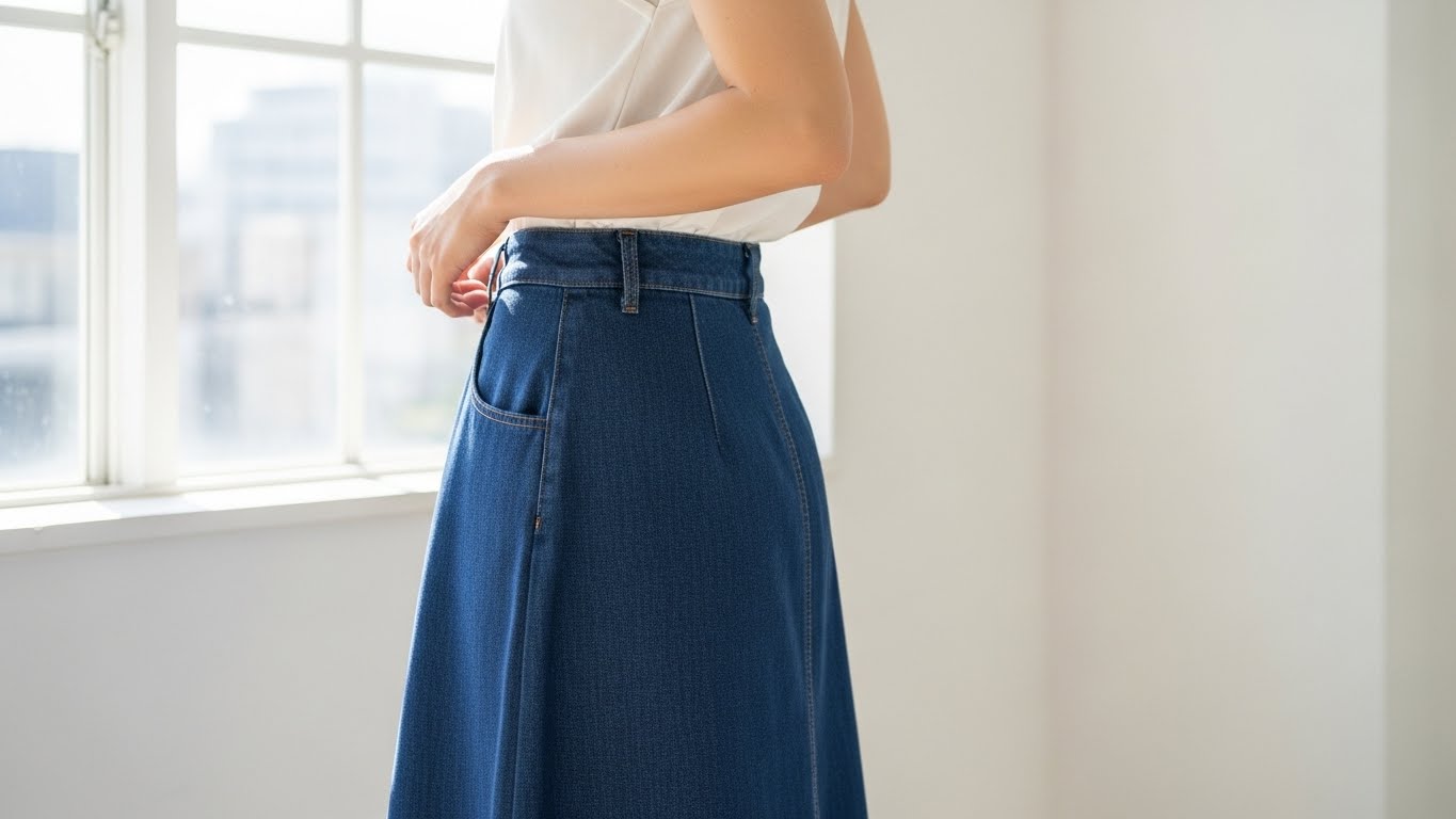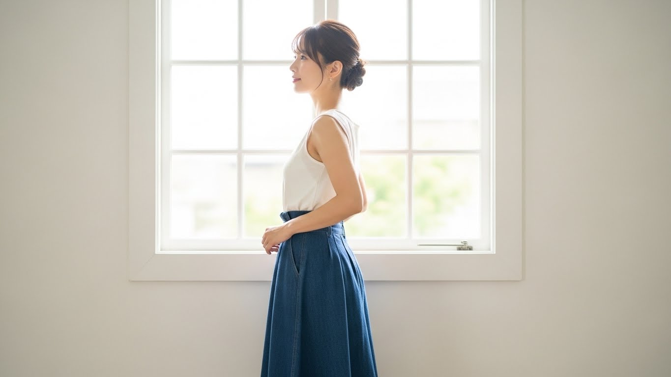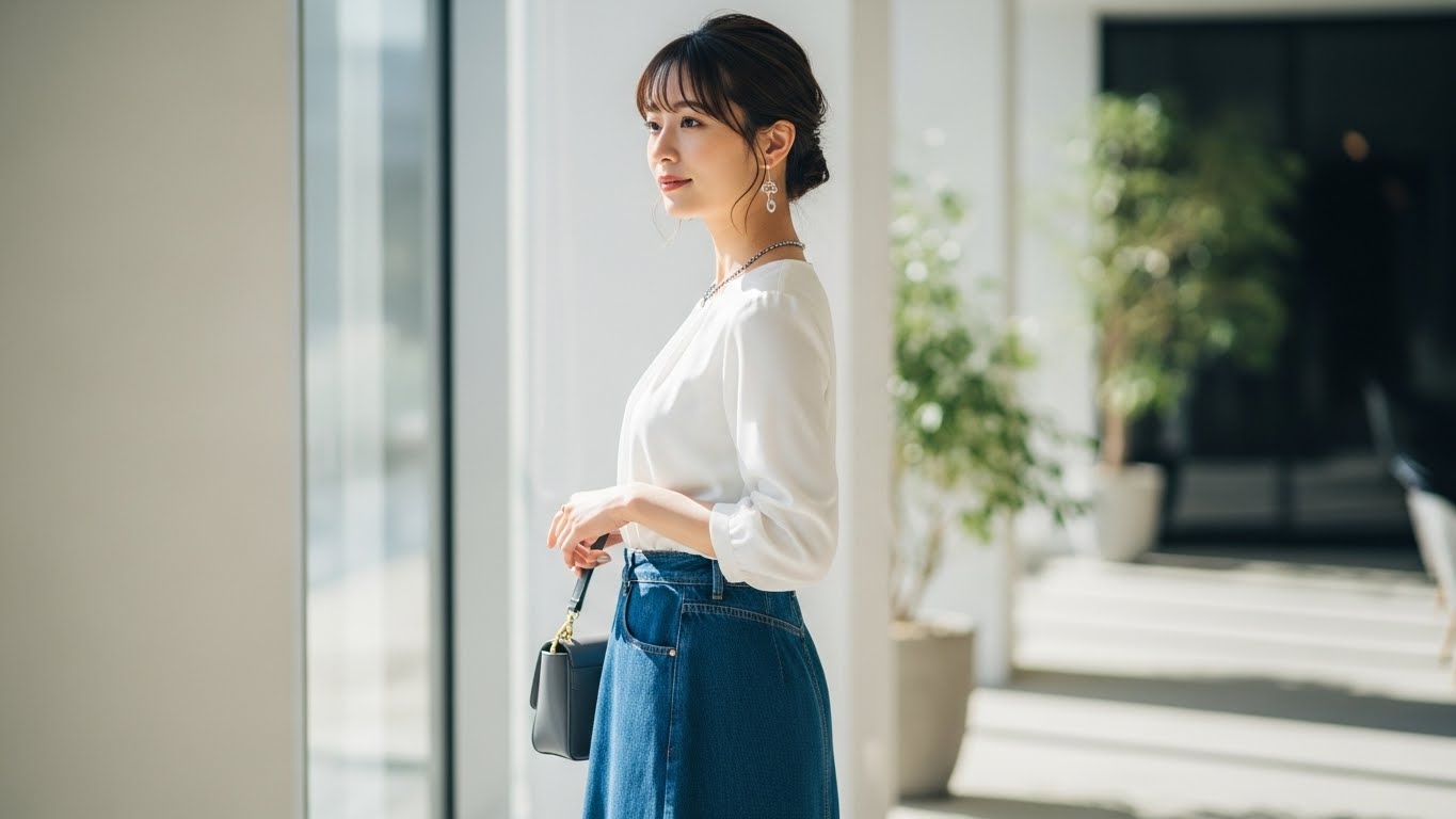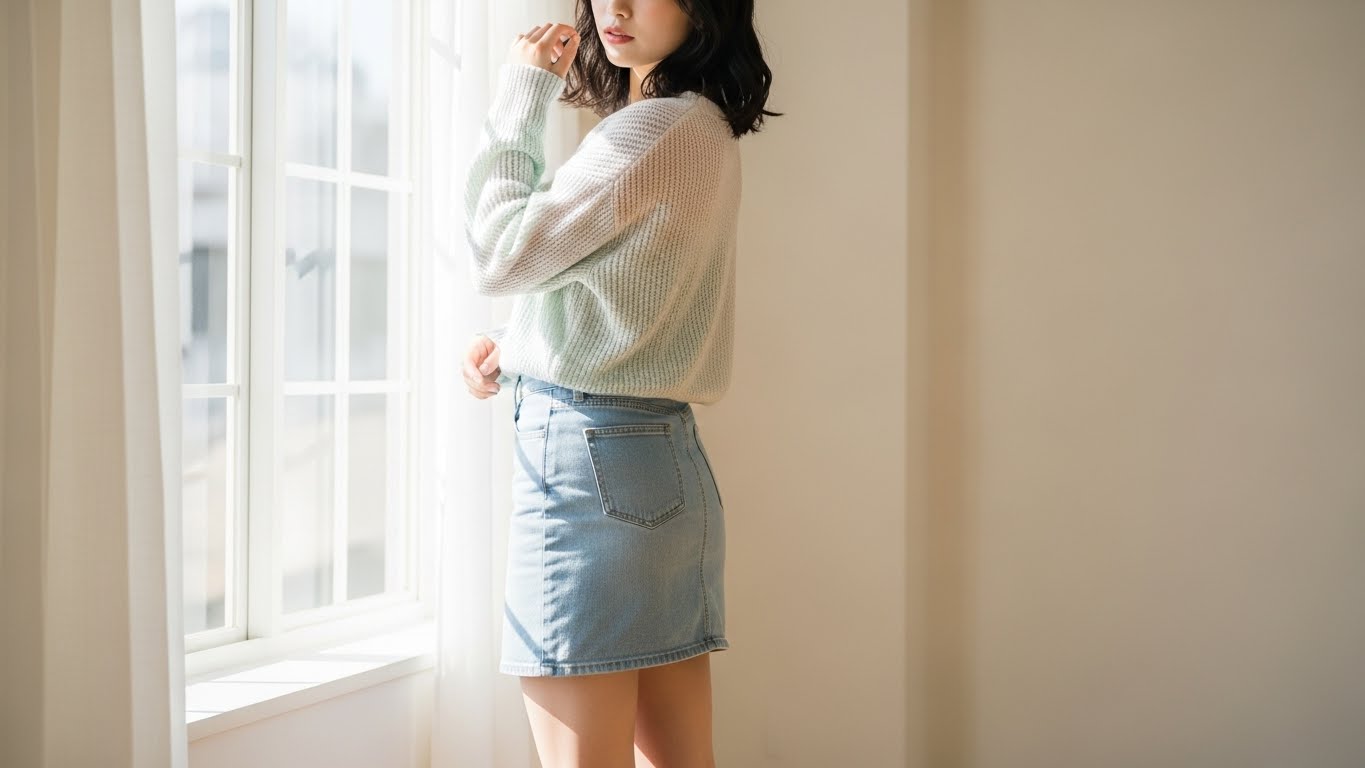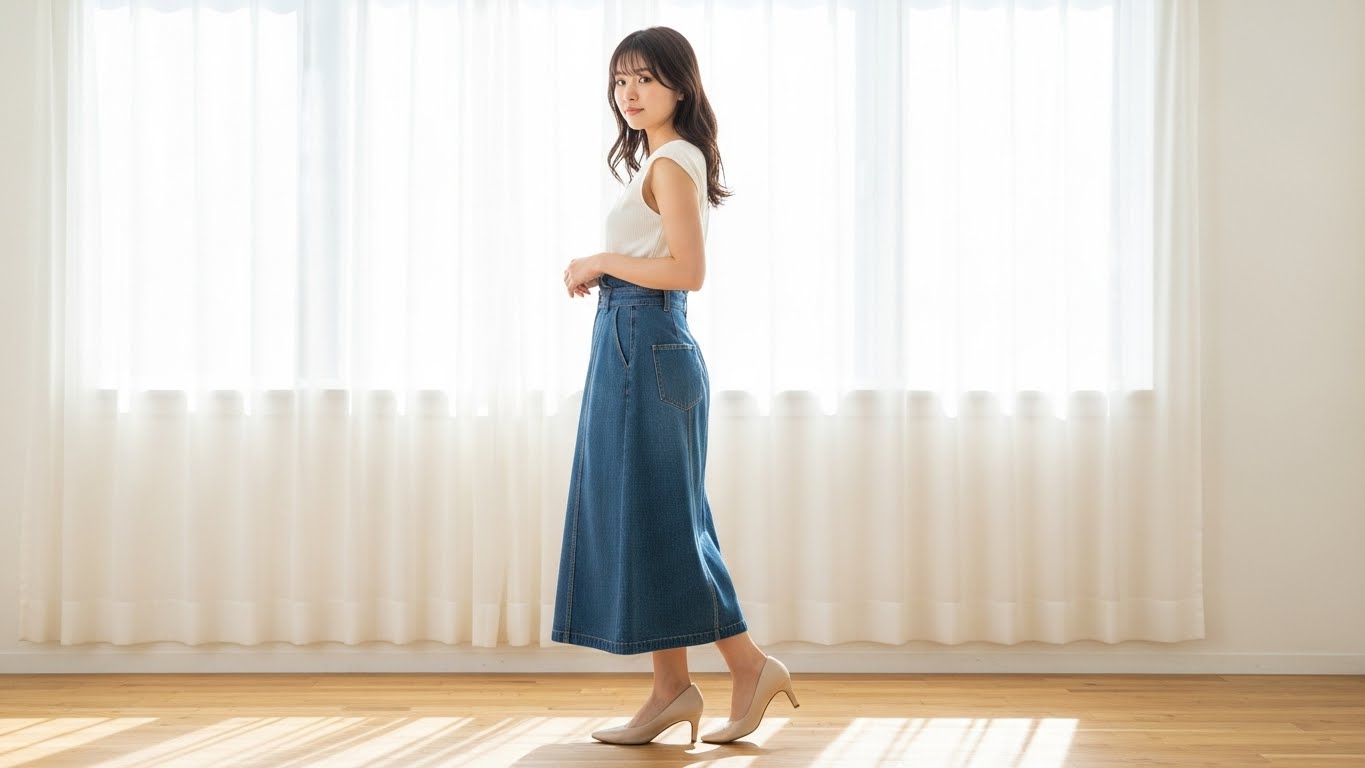 低身長さんのデニムスカートコーデでお悩みではありませんか?この記事では、150cm台の方でもバランス良く着こなせる選び方・組み合わせ方を解説します。