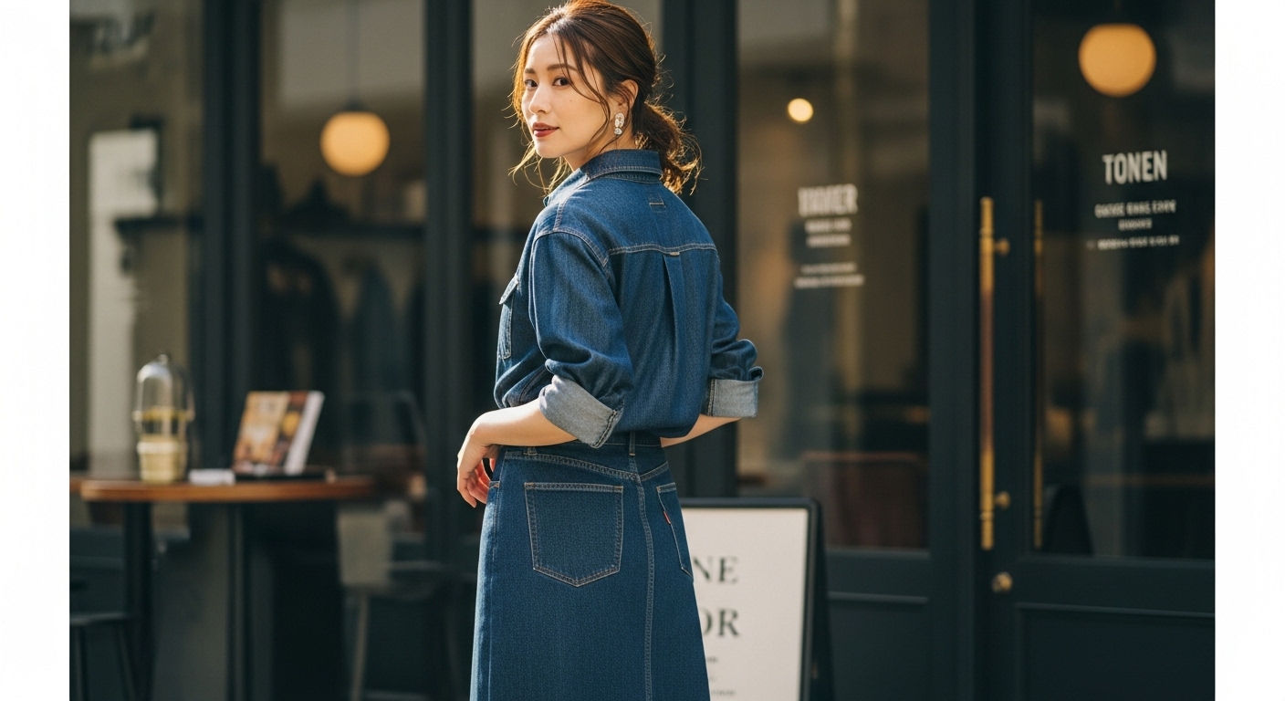 デニムのカジュアルさとスカートの上品さが良いバランスを生み出します。