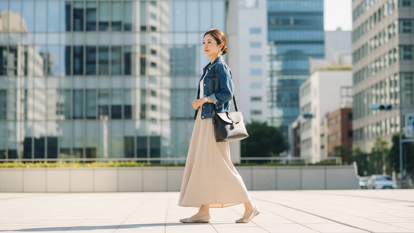 デニムジャケットを大人っぽく着こなすなら、ボトムス選びも重要です。