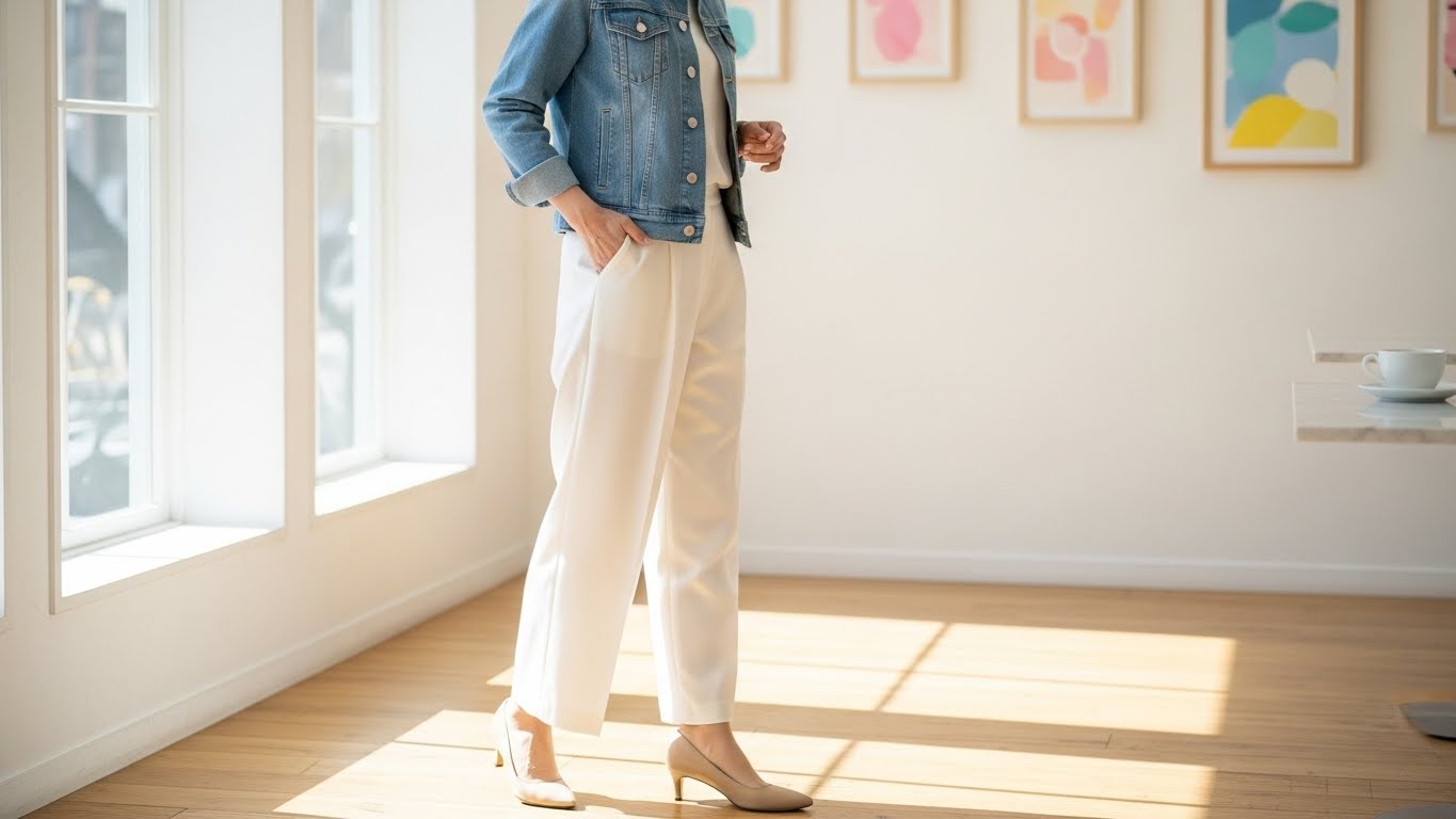 ☑ アイスブルーのデニムジャケット×白ボトムス
