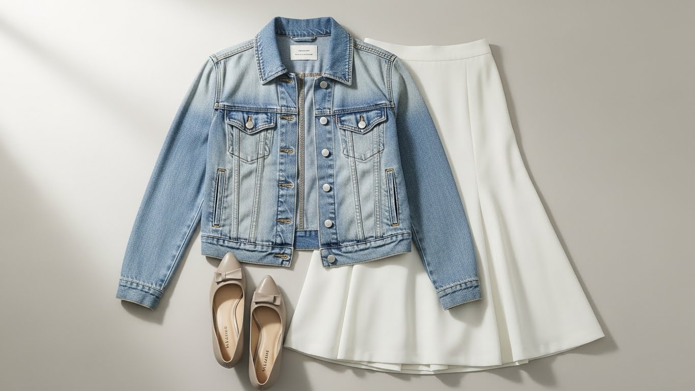 ショート丈のデニムジャケット×ひざ下〜ミモレ丈のフレアスカートで、上半身コンパクト・下半身ふんわりの理想バランスが完成します。