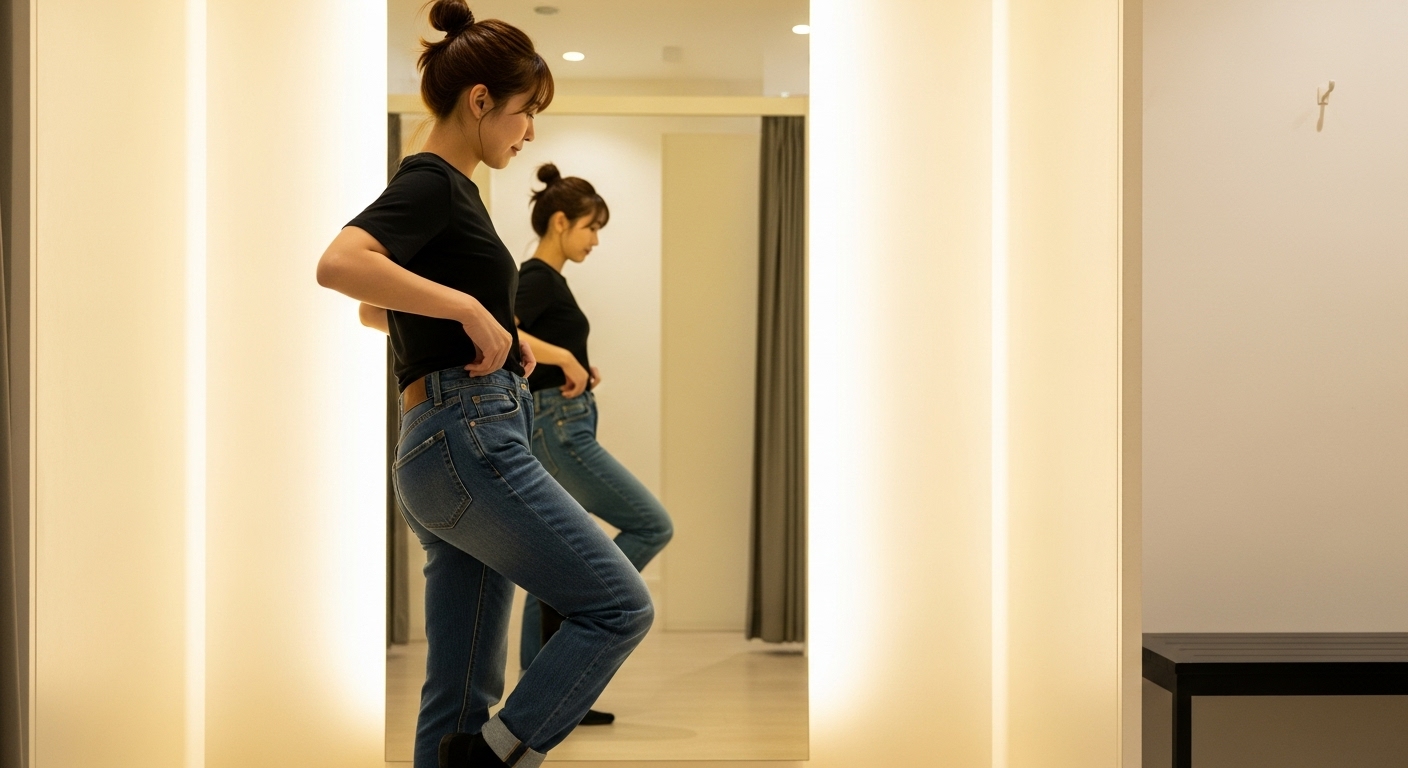 立った状態で鏡を見たとき、ウエストの最も細い部分にデニムのウエストラインがくるのが理想的です。