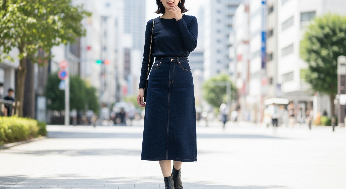 具体的には、ダークネイビーかブラックのストレートシルエット、ロング丈のデニムスカートが最適です。