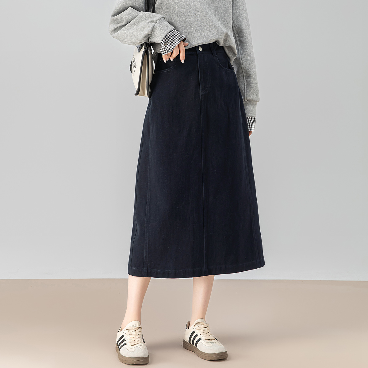 スニーカーを合わせる場合は、デニムスカートと同系色を選ぶと、脚のラインが長く見えます。